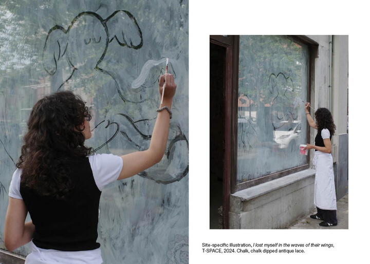Some afternoons, when not sculpting, the artist decided to draw. However, paper felt limiting, confined to the notebook. Seeking a deeper connection with their studio, which they considered a nest, the artist felt the need to embody the space. They chose to draw with charcoal until they felt satisfied.