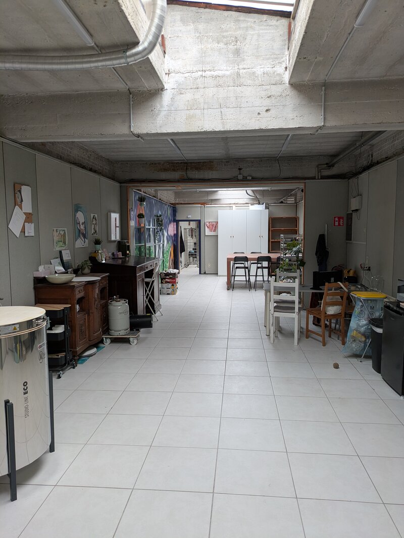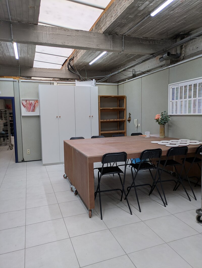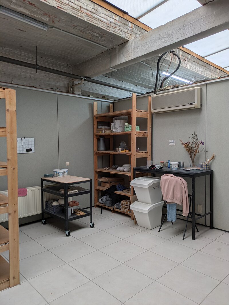 Atelierruimte van 20m2 in een grotere ruimte waarin keramist-pottenbakker werkt. Er is veel daglicht door een lichtstraat over de ganse ruimte. Geen centrale verwarming: bijwarmen met infraroodstraler is mogelijk. Naast het privéatelier is er een gemeenschappelijke lichte ruimte waarin nog extra werkplek met tafels is die gebruikt mag worden wanneer nodig. Koelkast, koffiezet, waterkoker, microgolfoven aanwezig. Keramiekoven kan eventueel ook gebruikt worden, na overleg. Oude Belgische krachtstroom (3x230volt) aanwezig. Huurprijs 150 euro inclusief BTW. Elektriciteit, water en gebruik van gemeenschappelijke delen inbegrepen.