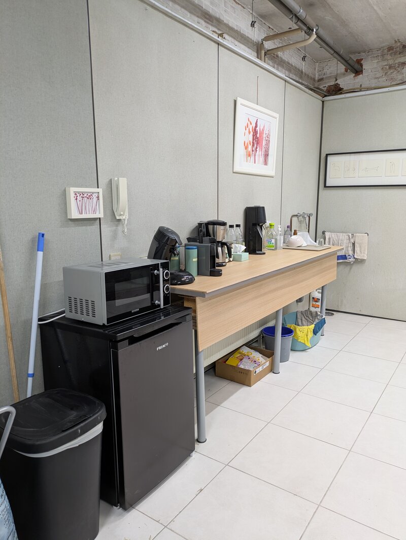 Je huurt niet alleen een ruimte, maar maakt ook deel uit van de plek en haar werking. Er zijn verschillende gedeelde faciliteiten, waaronder een kleine keuken, toiletten, een spuitcabine met afzuigwand en eventueel stockage in metershoge opslagrekken.