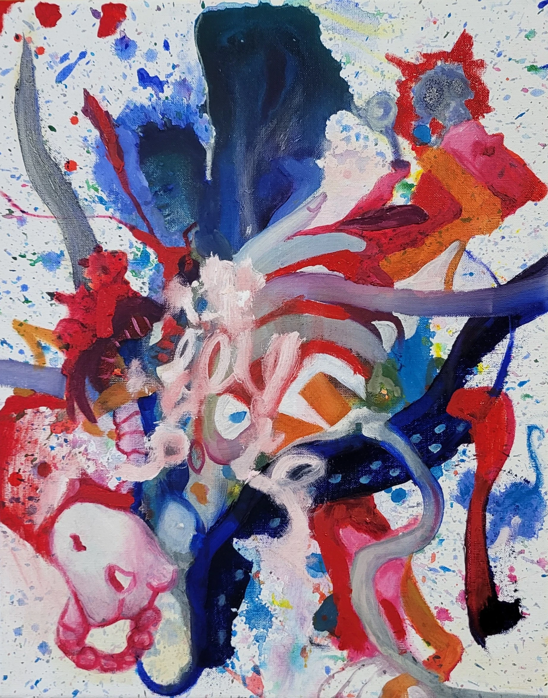 In her paintings, Eefje Van den Brande always starts from a blot on which she lets her imagination loose. She wants to play with the image, using various techniques and layers. A mix of acrylic and oil paint always produces surprising results.