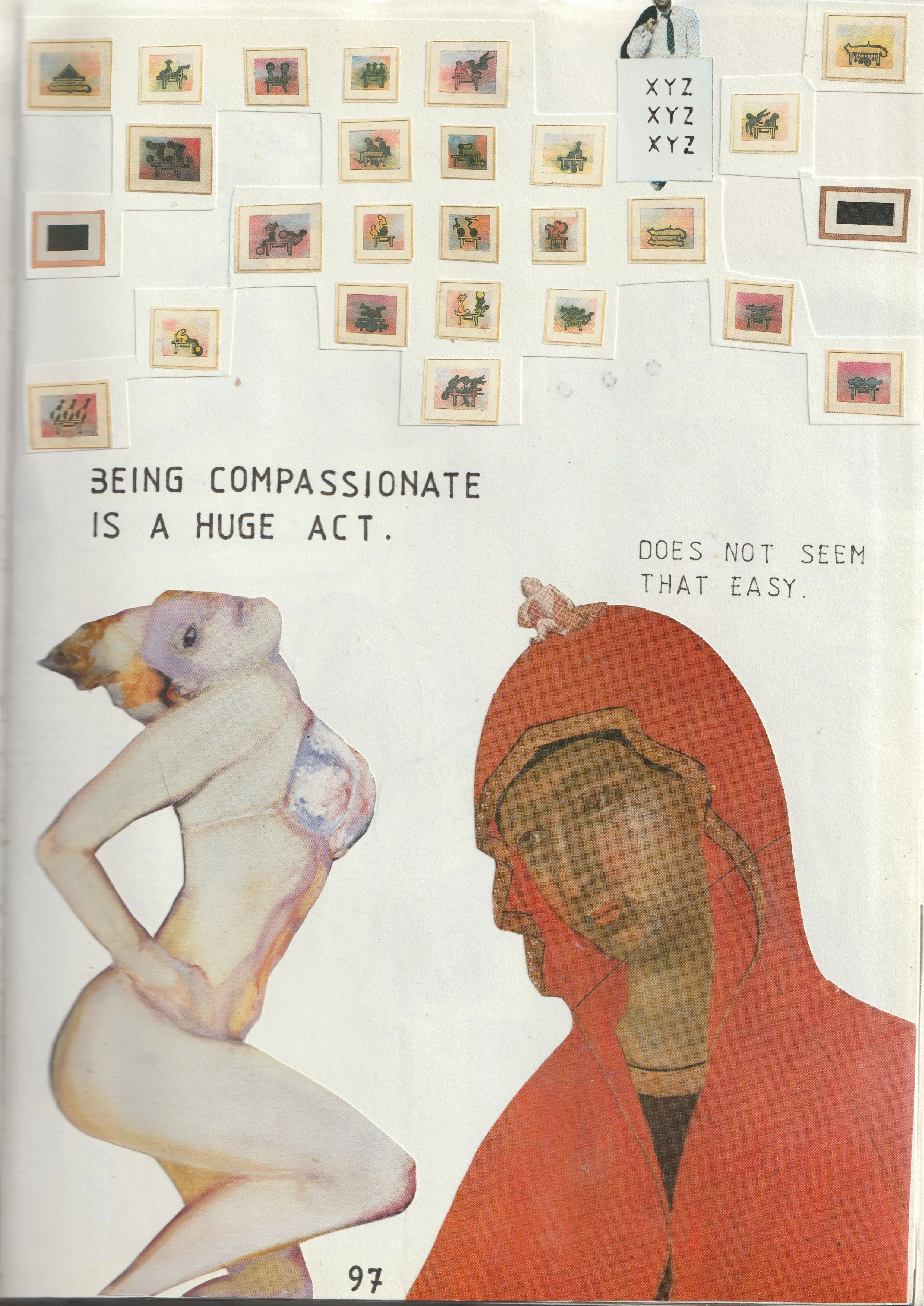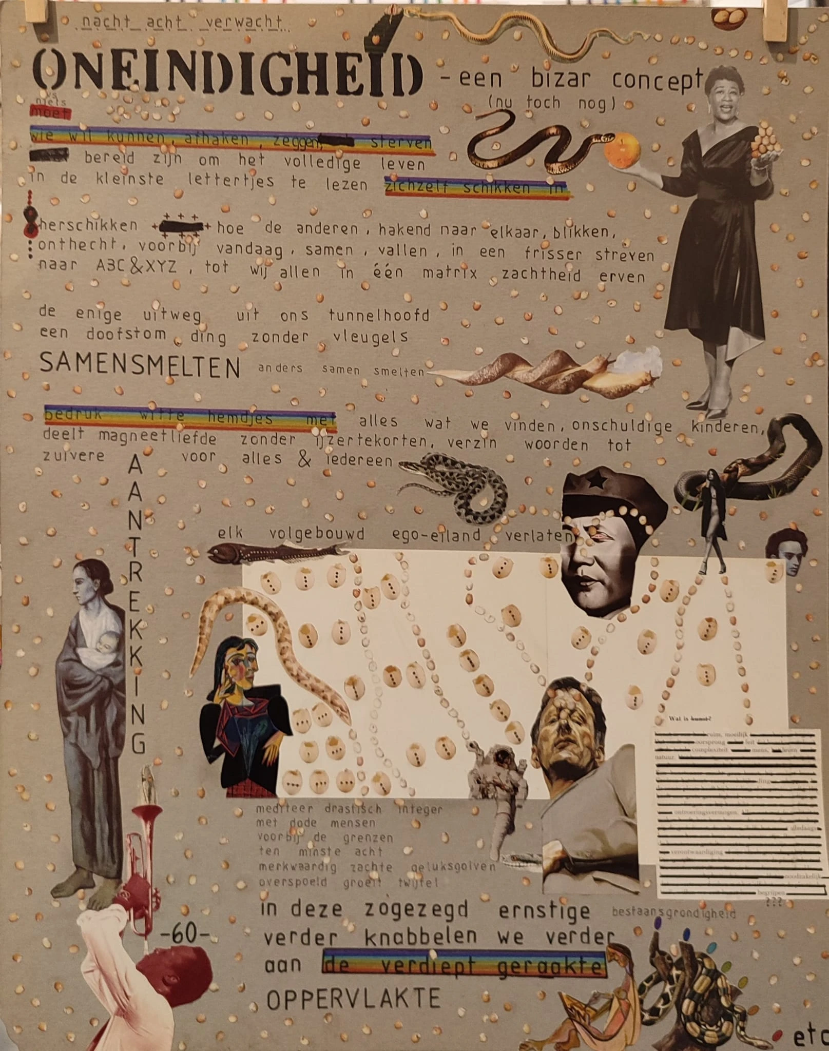 56 gedichten geornamenteerd met collagekunst gespreid over 48 kartonnen van 50x40 cm die aan voor- en achterzijde verlucht zijn.