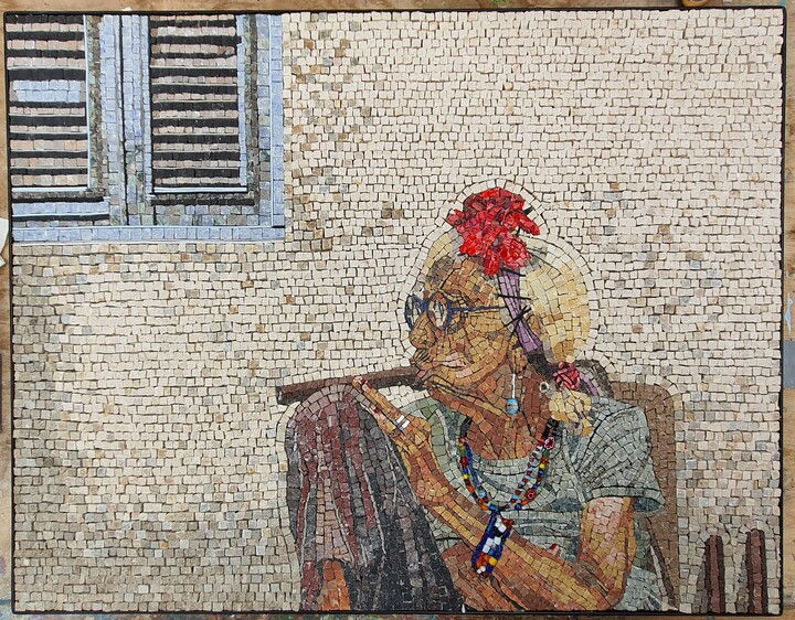 Mijn werken verwijzen vaak naar de Romeinse mozaïeken, en ook maskers horen daar in thuis. Maar mijn masker heeft verschillende lagen, want dragen we niet allemaal altijd een beetje een masker, weten we écht wie we zijn? Of is ons eigen gelaat ook een soort van masker? Voor mij verwijst dit beeld naar innerlijke wonden die we niet graag tonen aan de ander, omdat we ons allemaal van onze 'beste' kant willen laten zien. De jutte stof verwijst ook een beetje naar brandwondemaskers of waar uiterlijke en innerlijke pijn elkaar ontmoeten.