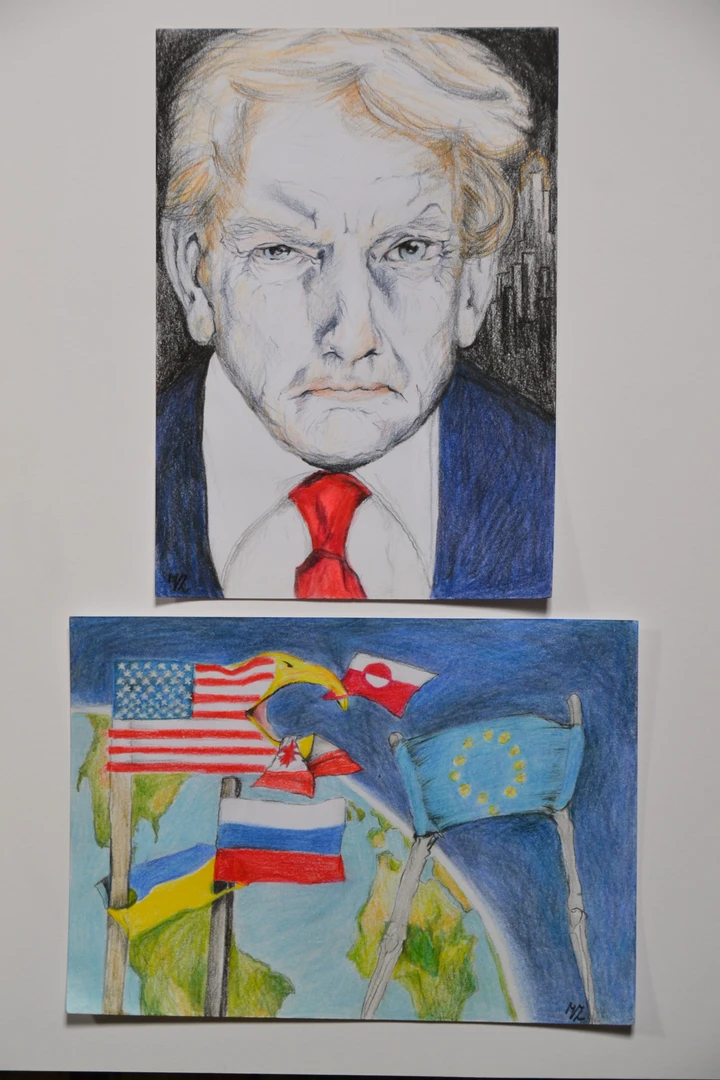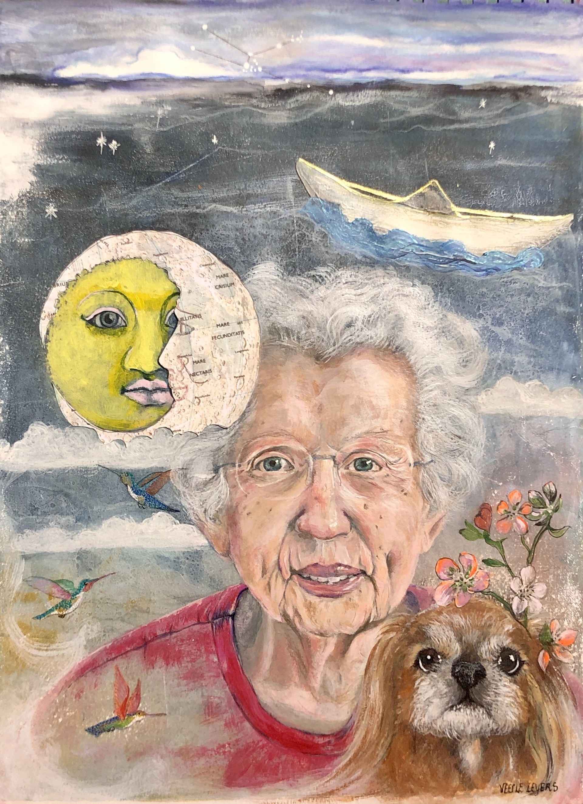 Een bestaand werk werd overschilderd met witte gesso. Vanuit de resterende doorschijnende kleuren zag ik enkele vlakken die me aan lichamen deden denken. Om beide lichamen te verbinden maakte ik dankbaar gebruik van enkele kleuren, details en de resterende kaderlijnen. Er is een contrast te zien tussen beiden. De vrouw is meer ingetogen de man treedt alle begrenzingen over. Hierdoor krijgt de rode lijn een soort functie als kader, als beheersend element. Dit werk is puur intuïtief ontstaan. Van het oorspronkelijke werk was nauwelijks nog iets te zien. De tekeningen werden manueel getekend met potloden.