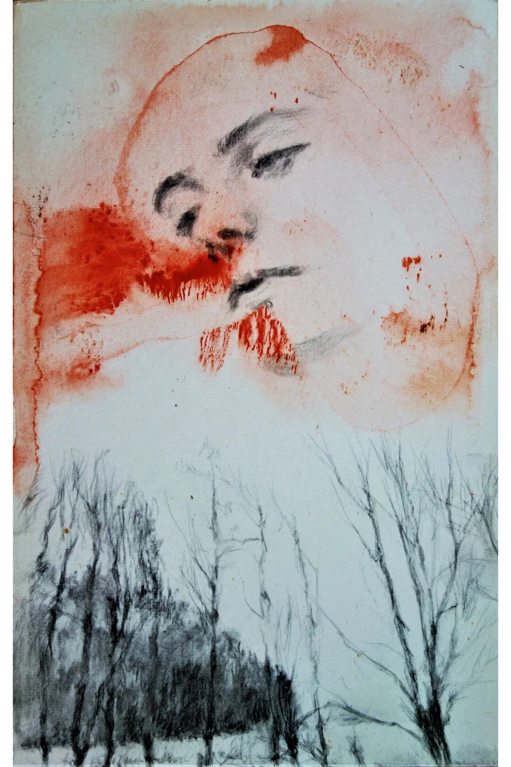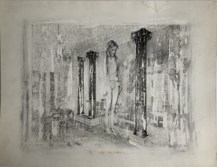 Dit werk maak deel uit van een nieuwe reeks. Oude prenten worden eerst bewerkt door Christian met verf , wegkrassen. Graphite enz… Ik laat me inspireren door wat ontstaat, wat achterblijft en maak een project op tablet met foto’s die we zelf gemaakt heb of uit magazines. Als de maquette voldoet aan onze beeldtaal, een verhaal dat past bij onze wereld, wordt het de basis van een tekening die ik maak met houtskool en/of potlood. Soms wordt het nadien terug bewerkt door Christian. Het doel is altijd een beeld, een atmosfeer creëren die bij de kijker een verhaal oproept. Een verhaal, en dat vinden we cruciaal, dat door door iedereen anders ingevuld wordt.