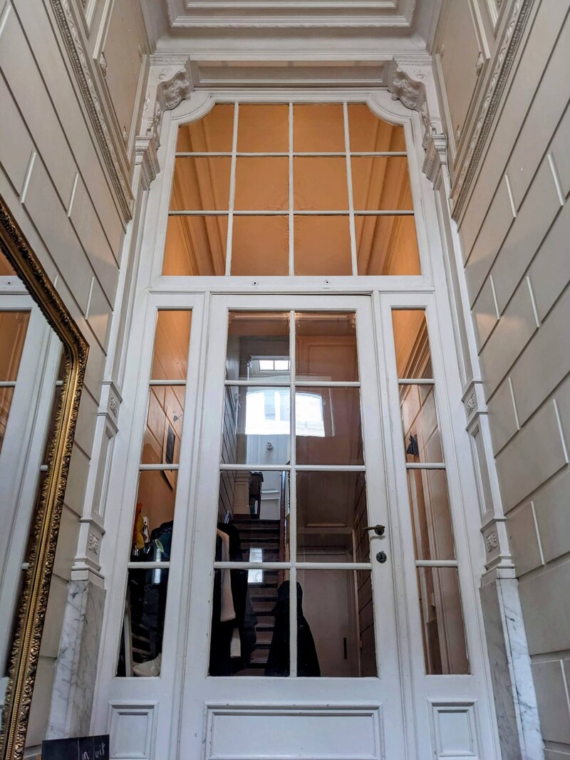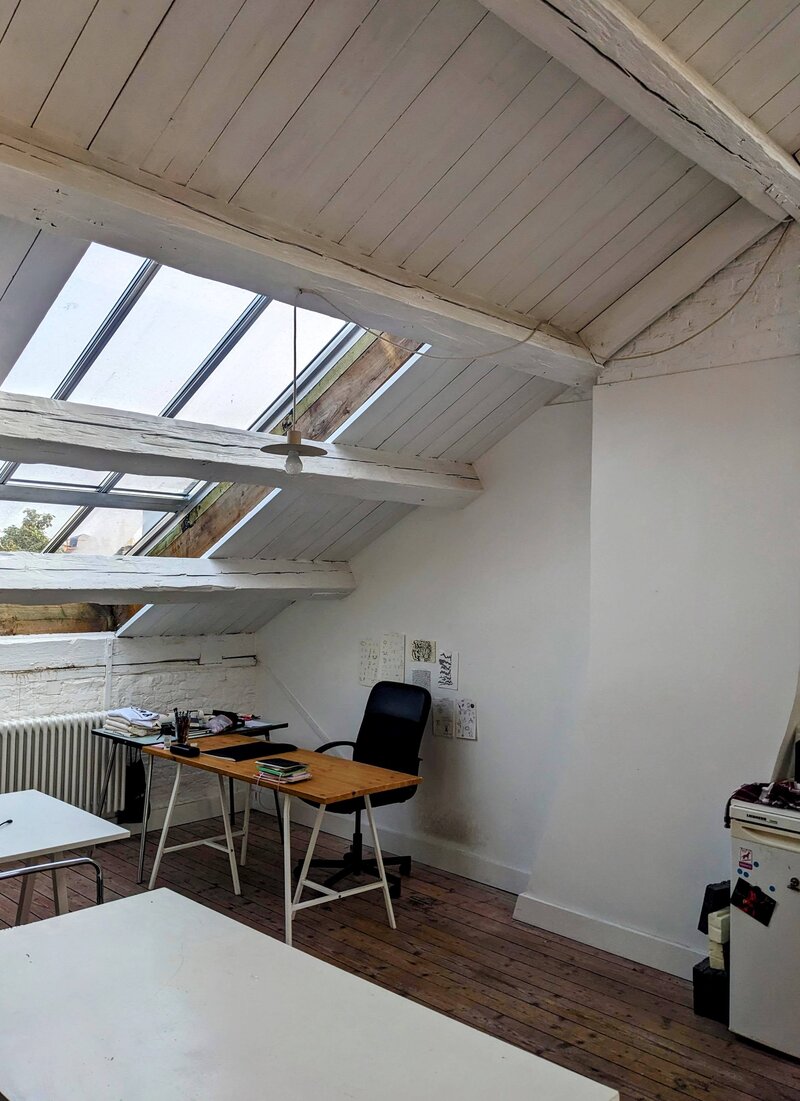 Ruimte 2: 32 m² – lichtrijk atelier op de eerste verdieping, voorzien van houtkachel